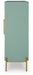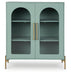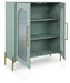 Details Made with engineered wood, Light green finish, Goldtone metal door pulls and legs, 2 doors with fluted glass panels, 2 shelves, Minor assembly required, simply lay flat and attach feet