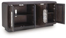 Function and style merge perfectly in this accent cabinet. Doors with oversized marble pulls open to reveal shelving, while the rounded edge design and espresso brown finish provide distinctive on-trend touches. Whether you use it to conceal clutter or as a TV stand, this exquisite piece defines modern elegance.