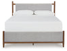 Details B615B7: Includes upholstered panel headboard and footboard , Solid wood frame, Due to the use of natural wood materials, some variations may occur , Frame with medium brown wood tone finish, Polyester upholstery, Tapered legs, Foundation/box spring required, sold separately , Mattress available, sold separately, Assembly required, B615B1: Includes dresser and mirror, Made with hardwood solids, mango wood veneer and MDF substrates, Medium brown wood-tone finish, 6 drawers with fully finished interior, dovetail construction and heavy duty ball-bearing side glides, Round tapered legs, Mirror attaches to back of dresser,