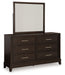 | Details | B618B5: Includes upholstered panel headboard, panel rails and panel footboard with slats, Made with hardwood solids, engineered wood and MDF substrates, Grayish brown wood-tone finish, Floating inset upholstered panel in polyester Next-Gen Nuvella fabric surrounded by LED backlight, Next-Gen Nuvella™ is a performance fabric that is soft, easy to clean, stain-resistant and durable, Clean fabric with mild soap and water, let air dry; for stubborn stains, use a solution of 4 oz. bleach to 28 oz. water, Light switch is located on each side of headboard and includes dual USB charging port (USB-A and USB-C), Power cord included; UL Listed, Foundation/box spring required, sold separately, Mattress available, sold separately, Assembly required, B618B1: Includes dresser and mirror, Made with hardwood solids, engineered wood and MDF substrates, Grayish brown wood-tone finish, Metal bar pulls with satin nickel-tone finish, 6 smooth-gliding drawers with dovetail construction and heavy duty ball-bearing side glides (top drawers felt lined), Mirror attaches to back of dresser, B618-92: Made with hardwood solids, engineered wood and MDF substrates, Grayish brown wood-tone finish, Metal bar pulls with satin nickel-tone finish, 2 smooth-gliding drawers with dovetail construction and heavy duty ball-bearing side glides (top drawers felt lined), | |
