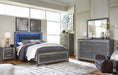 Details B214B1: Made of engineered wood (MDF/particleboard) and decorative laminate, Gray finish with replicated wood grain, Faceted chrome-tone pulls and accents, 6 smooth-operating drawers, Drawers lined with faux linen laminate, Mirror attaches to back of dresser, Includes tipover restraint device, Assembly required, B214B2: Includes headboard, footboard and side rails, Made of engineered wood (MDF/particleboard) and decorative laminate, Gray finish with replicated wood grain, Faux leather upholstery, Faux crystal and faceted chrome-tone metal accents, Accent LED lights with remote to control color and brightness, Power cord included; UL Listed, Foundation/box spring required, sold separately, Mattress available, sold separately, Assembly required, Bed is compatible with an adjustable base,