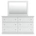 | Details | B139B41: Includes panel headboard/footboard and rails, Made with engineered wood (MDF/particleboard/plywood) and decorative laminate for the right balance of affordability and durability, Replicated solid white paint, Decorative laminate replicates natural or man-made material surfaces with consistent color, pattern and texture, Foundation/box spring required, sold separately, Mattress available, sold separately, Assembly required, B139B40: Includes dresser and mirror, Made of engineered wood (MDF/particleboard), Knobs with pewter-tone finish, Scalloped moulding, 6 smooth-operating drawers, Includes tipover restraint device, Mirror attaches to back of dresser; can also be mounted on wall horizontally or vertically, Safety is a top priority, clothing storage units are designed to meet the most current standard for stability, ASTM F 2057 (ASTM International), Drawers extend out to accommodate maximum access to drawer interior while maintaining safety, | |