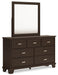 | Details | Includes dresser and mirror, Made with hardwood solids, engineered wood veneer and MDF substrates, Dark brown finish, Metal bar pulls with bright nickel-tone finish, 7 smooth-gliding drawers with dovetail construction and metal center guides, Drawer interiors are lined with a wood grain laminate for a clean, finished look, Top moulding on dresser, Mirror attaches to back of dresser | |