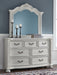 | Details | Includes dresser and mirror, Made with hardwood solids, veneer and MDF substrate with cast resin components , Antiqued white finish, Metal pulls with polished pewter-tone finish , 7 smooth-gliding drawers with fully finished interiors, French/English dovetail construction and heavy-duty ball-bearing side glides (top drawers felt lined), Thick decorative moulding, Mirror attaches to back of dresser | |