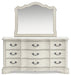 | Details | B980B5: Includes headboard, footboard and rails, Made with hardwood solids, spruce veneer, MDF substrates and cast resin components , Antiqued white painted finish, Polyester upholstery, Button tufting, Foundation/box spring required, sold separately, Mattress available, sold separately, Assembly required, B980B1: Includes dresser and mirror, Made with hardwood solids, spruce veneer, MDF substrates and cast resin components, Antiqued white painted finish, 9 drawers with fully finished interiors, French and English dovetail construction and ball-bearing side glides, Metal bar pulls with aged pewter-tone finish, Mirror attaches to back of dresser, | |