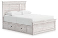 Details Includes panel headboard, panel footboard, under bed storage unit, platform rails and roll slats , Made with engineered wood (MDF/particleboard/plywood) and decorative laminate for the right balance of affordability and durability, Whitewash replicated worn through paint over replicated wood grain with authentic touch, Decorative laminate replicates natural or man-made material surfaces with consistent color, pattern and texture, Handles with dark bronze-tone finish, 2 smooth-gliding storage drawers, Bed does not require additional foundation/box spring; accommodates most zero clearance adjustable bases with the addition of a bunkie board , Mattress available, sold separately, Assembly required