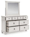 | Details | PCB823B4: Includes headboard/footboard panels, posts and poster rails , Made with hardwood solids, veneers and MDF substrates , Side rails feature laminated solid hardwood slat support rails (or LVL) with glued and screwed blocking for added strength, Rubbed antiqued white finish , Foundation/box spring required, sold separately, Mattress available, sold separately , Assembly required, PCB823B1: Includes dresser and mirror, Dresser made with hardwood solids, veneers and MDF substrates , Mirror made with solid wood, Rubbed antiqued white finish, Metal hardware with pewter-tone finish, 8 smooth-gliding drawers with fully finished interiors, French/English dovetail construction and heavy-duty ball-bearing side glides, Top drawers felt lined, Mirror attaches to back of dresser, | |