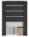 Details PCB2108B17: Includes panel headboard/footboard, rails with side storage and roll slats, Made with engineered wood (MDF/particleboard/plywood) and decorative laminate for the right balance of affordability and durability , Charcoal finish over replicated oak grain with authentic touch, Decorative laminate replicates natural or man-made material surfaces with consistent color, pattern and texture, 2 smooth-gliding drawers, 2 storage cubbies, Bed does not require additional foundation/box spring; accommodates most zero clearance adjustable bases with the addition of a bunkie board, Mattress available, sold separately, Minor assembly required, PCB2108B1: Includes dresser and mirror, Made with engineered wood (MDF/particleboard/plywood) and decorative laminate for the right balance of affordability and durability , Charcoal finish over replicated oak grain with authentic touch, Decorative laminate replicates natural or man-made material surfaces with consistent color, pattern and texture, Large-scale dark colored handles, 6 smooth-gliding drawers, Drawer interiors are lined with a faux linen laminate for a clean, finished look , Mirror attaches to back of dresser; can also be mounted on wall horizontally or vertically, Safety is a top priority, clothing storage units are designed to meet the most current standard for stability, ASTM F 2057 (ASTM International), Drawers extend out to accommodate maximum access to drawer interior while maintaining safety, Minor assembly required,