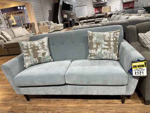 Heritage Home FurnishingsThis is a stylish mid-century modern loveseat upholstered in a soft, light blue-gray fabric. Its compact and structured design features: ...