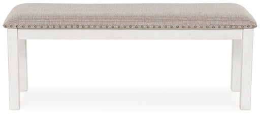 Signature Design by Ashley®The Robbinsdale dining bench is sure to impress come mealtime. With its antiqued white finish and light gray upholstery with nailhead trim, modern ...