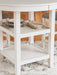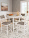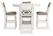 Details Includes counter height dining table and 4 counter height bar stools, Table made with rubberwood solids, mindi veneer and MDF substrates, Bar stool made with solid wood frame and engineered wood, White finish, Light gray textured polyester upholstery, Foam seat and back cushions, Backrest with fretwork accent, Bar stool with adjustable levelers; footrest for added support, Table includes 2 display shelves, Seats up to 4, Tapered legs, Assembly required