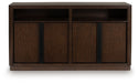 Casual contemporary styling with a decidedly modern vibe. This dining server dresses your dining spot in on-trend elegance with its rich warm brown finish. Full-length metal pulls in a matte black tone add a subtly cool touch to spacious storage cabinets. And thanks to its versatile functionality, this four-door piece effortlessly works as a sideboard, entryway table or TV stand. Now there’s a simply stunning show of great taste—wherever you place it.