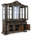 | Details | Includes dining buffet and hutch, Made with hardwood solids, oak and ash swirl veneers with MDF substrates and cast resin components, Dark brown finish, Hutch with beveled glass windows. mirrored glass interior, 2 clear glass shelves and LED display lighting, Buffet cabinets each with single adjustable shelf and finished drawers with felt lining, Assembly required | |