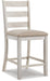 Raise the bar on small space living with this 5-piece counter-height dining set. An inspired choice for coastal chic or modern farmhouse settings, this strikingly simple table marries a brown tone plank-effect top with a rubbed-through grayish white base for timeworn appeal. The table’s side shelves and 8-bottle wine rack cleverly balance form and function while the comfortably cushioned bar stools with classic ladderback styling serve up high style.