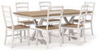 | Details | PCD627-35: Made with hardwood solids, mango wood veneer and MDF substrate, Top with light butcher block oak veneer, Frame with antiqued white finish, Self-storing butterfly leaf, Assembly required, PCD627-01: Made with solid wood frame, Seat with light butcher block oak veneer, Frame with antiqued white finish, Ladderback design, Contoured seat for added comfort, Assembly required, | |