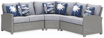 Indulge in backyard bliss. This outdoor sectional has a straightforward sense of style with its light gray resin wicker and wood-look finish. Gray high-performance Nuvella+™ fabric covers the seat and back cushions, weathering the elements and keeping your aesthetic casually cool.