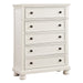 Casual transitional styling lends versatility to the placement of the Laurelin Collection in a number of bedroom settings. The white finish can transition from traditional to country casual, with antiqued bronze knob hardware punctuating the look of each framed drawer front and bun feet providing support.