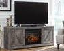 | Details | Includes TV stand and electric fireplace insert (W100-101), Made with engineered wood (MDF/particleboard), Rustic gray finish over replicated oak grain with plank effect, TV stand with 2 storage cabinets (each with an adjustable shelf) and removable/adjustable center shelf, Cutouts for wire management and ventilation, Electric fireplace insert provides up to 5,386 BTU/1,500W and warms up to 1,000 square feet (heats larger rooms), 7-level temperature setting; 5 levels of flame brightness, LED-lit multi flame display operates with or without infrared heat, Realistic-looking log set with dynamic glowing embers, Remote control with LED display, Timer function with programmable ranges from 10 minutes to 9 hours; overheating control device, Power cord included; UL Listed, Assembly required; simply remove the center shelf and back panel to make room for the fireplace insert | |