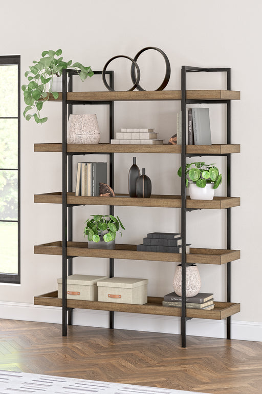 Signature Design by Ashley®Got books? Bring them to this bookcase. Its industrial mix of dark wood and black metal brings trendsetting vibes to your home. Four sturdy shelves...