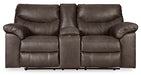 Rock the cool look of leather minus the hefty price tag with this reclining loveseat with console. Rich with tonal variation, the indulgently soft upholstery sure looks like the real thing. And talk about indulgent comfort. Double stuffed armrests and sumptuous cushions cradle and support in all the right places. Distinctive scooped stitching enhances this reclining loveseat’s contemporary flair. Cup holders and hidden storage complete the experience.
