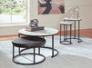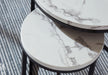 | Details | Includes coffee table, 2 end tables and ottoman, Tabletop made with faux Carrara marble laminate and MDF substrate, Tubular metal frame with dark powder coat finish, Ottoman with black faux leather upholstery, Nesting design | |