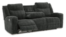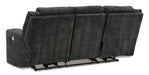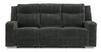 Ideal for those who seek synergy of form and function, this power reclining sofa with drop-down table is made for everyday indulgence. Its motion features are decidedly modern; the upholstery velvety soft. A versatile, dark neutral hue takes you back to style basics. Track arms frame the chunky profile, completing this relaxed approach to contemporary decor.