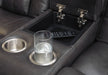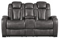 Looking for seating with all the bells and whistles? This power reclining loveseat has you covered. Get double the relaxation as you recline your body and adjust your headrest. Pull up the center console to stash your remotes. With USB charging ports, your devices will enjoy this loveseat, too. Stainless steel cup holders accompany you on either side. It's all wrapped up in quality faux leather with fashion-forward jumbo stitching, for a look and feel you’ll love.