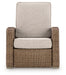 Details All-weather resin wicker handwoven over rust-resistant aluminum frame with durable powder coated finish, Powder coated steel recliner mechanism, Press-back reclining motion, Solution-dyed high-performance fabric, Nuvella is an outdoor fabric that can be cleaned and offers UV resistance, Clean fabric with mild soap and water, let air dry; for stubborn stains, use a solution of 4 oz. bleach to 28 oz. water, Stainless steel hardware, Designed to withstand the harsh elements of the outdoors, Assembly required