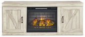 | Details | Includes TV stand, bridge, 2 piers and fireplace insert, Made of engineered wood (MDF/particleboard) and decorative laminate, Wispy white finish over replicated oak grain with authentic touch, One open storage area and 2 single-door storage areas (each with adjustable/removable shelf), Cutouts for wire management and ventilation, Electric fireplace insert provides up to 5,386 BTU/1,500W and warms up to 1,000 square feet (heats larger rooms), 7-level temperature setting; 5 levels of flame brightness, LED-lit multi flame display operates with or without infrared heat, Realistic-looking log set with dynamic glowing embers, Remote control with LED display, Timer function with programmable ranges from 10 minutes to 9 hours; overheating control device, Power cord included; UL Listed, Assembly required; simply remove the center shelf and back panel to make room for the fireplace insert | |