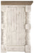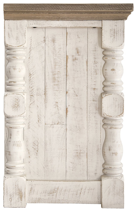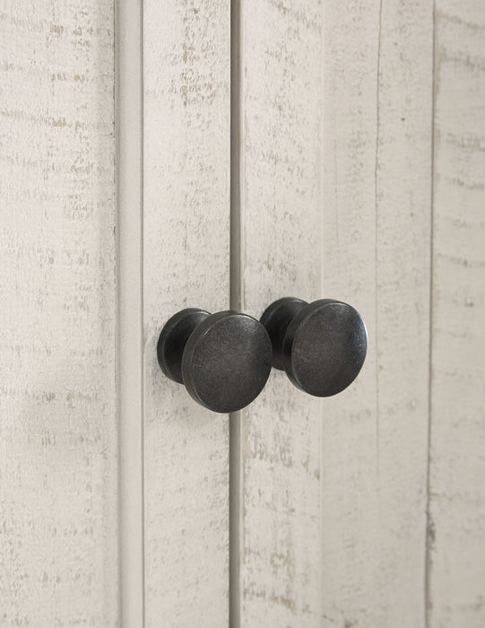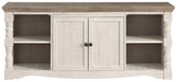 Details Made of pine wood, pine veneers and engineered wood, Two-tone distressed finish: weathered gray top; vintage white base, TV stand with 2-door cabinet with single-shelf storage and 2 open shelves, Aged iron-color hardware, Cutouts for wire management, Assembly required