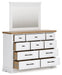 Details B844B4: Includes panel headboard, storage footboard, rails and roll slats, Footboard made with hardwood solids, MDF substrates and butcher block oak veneer, Headboard and rails made with hardwood solids and MDF substrates, White finish, Headboard with inset black metal barn sash, 2 drawers in footboard with fully finished interior, dovetail construction and ball-bearing side glides, Pulls with matte black finish, Bed does not require a foundation/box spring, Mattress available, sold separately, Assembly required, B844B1: Includes dresser and mirror, Made with hardwood solids, MDF substrates and butcher block oak veneer, Dresser with 2-tone finish (white finish; butcher block oak veneer with natural finish), Pulls with matte black finish, 10 spacious drawers with fully finished interiors (top drawers felt lined), dovetail construction and ball-bearing side glides , Drawers with inset picture fronts, Mirror attaches to back of dresser, B844-93: Made with hardwood solids, MDF substrates and butcher block oak veneer, 2-tone finish (white finish; butcher block oak veneer with natural finish), Pulls with matte black finish, 3 spacious drawers with fully finished interiors (top drawers felt lined), dovetail construction and ball-bearing side glides, 110V power supply with dual USB charging ports, Power cord included; UL Listed, Drawers with inset picture frame fronts,