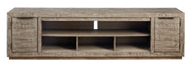 This extra-large TV stand is sure to win your heart with its daring take on modern rustic expression. Its crisp, clean minimalist-chic profile is enriched with striking pine wood grain and a weathered gray finish with distressed saw mark texture. Designed to turn your home theatre room into a style statement, the large center media cabinet can be removed for use with the optional W100-22 electric fireplace (sold separately).