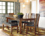 This large upholstered dining room bench beautifully captures the essence of rustic refinement. Plushly upholstered faux leather makes pulling up a seat so much more enticing. Makes for easy cleanup, too.