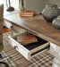 Details Made of wood, engineered wood and veneers, with cast resin components, Antiqued two-tone finish, Smooth-gliding drawer with dovetail construction, Dark bronze-tone finished metal hardware, Includes AC power supply, USB charging, Spring lift top, Assembly required