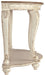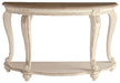 Elevating the art of traditional cottage styling, this demilune sofa table is sure to serve you beautifully for years to come. Antiqued two-tone aesthetic blends a chipped white with a distressed wood finished top for added charm. Classic cabriole legs and shapely lower shelf are a lovely twist. Decorative corbels add refinement.