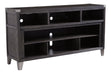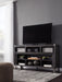 Make watching TV a joy with this large TV stand. Top surface accommodates up to 70-inch TVs. Its rustic-industrial style is sure to complement any contemporary decor through gray coloration, squared edges, zinc-tone corner bracket accents and nailhead detailing. Several vented open cubbies offer impressive shelf space, convenient for keeping all of your electronic gear within reach. Handy cutouts keep cords out of sight. Large center opening accommodates shelving insert (included) or the W100-22 large fireplace unit (sold separately).