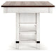 A high-style choice for dining spaces, this counter height dining table serves up the best in rustic farmhouse living. Its two-tone finish pairs a brown tabletop with a distressed vintage white base for a double helping of charm. The table features four storage drawers (two on each side), a seven-bottle wine rack and two open shelves for display. The sturdy post and bracket base design, with black metal accents and a thick dining top, lends an earthy appeal.
