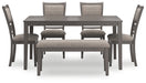 | Details | Includes dining table, 4 upholstered chairs and bench, Table made with rubberwood solids, mindi veneer and MDF substrates, Chair and bench made with solid wood and engineered wood, Light gray finish, Chair and bench with light gray textured polyester upholstery, Foam cushioned seat and backrest, Chair backrest features fretwork accent, Tabletop has reverse diamond patterned veneer, Table with tapered legs, Seats up to 6, Assembly required | |